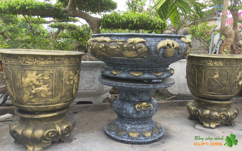 Đây là dòng sản phẩm phổ biến nhất, thường được dùng để trồng mai vàng hoặc các loại cây cảnh lớn trong sân vườn. Chậu được đúc khá dày, bên trong có cốt thép giúp tăng độ chắc chắn và chịu lực tốt. Bề mặt chậu được sơn phủ nhiều lớp giúp chống thấm. Hạn chế phai màu khi sử dụng ngoài trời. Các họa tiết như tứ linh hay tứ quý được đúc nổi rõ nét, tạo nên vẻ đẹp mang đậm phong cách truyền thống.